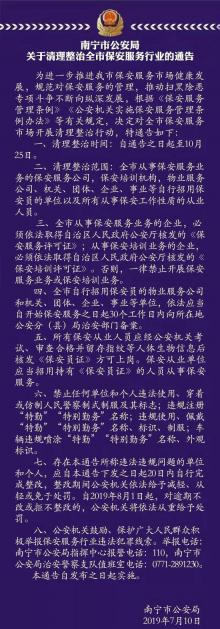 “根据《公安机关实施保安服务管理条例办法》和公安部的相关规定,从2011年开始,全国保安员陆续换着2011式保安员服装,并佩戴统一的保安服务标志。”这名负责人表示,存在上述违法违规问题的单位和个人,应当即日起自行完成整改,整改期间公安机关依法给予减轻、从轻或免于处罚。从8月1日起,对逾期不改或拒不整改的,公安机关将依法从重处罚。当然,如果群众发现有上述违法违规行为的,也可以拨打110报警,或者拨打南宁市公安局治安警察支队值班室电话0771-2891230进行举报。